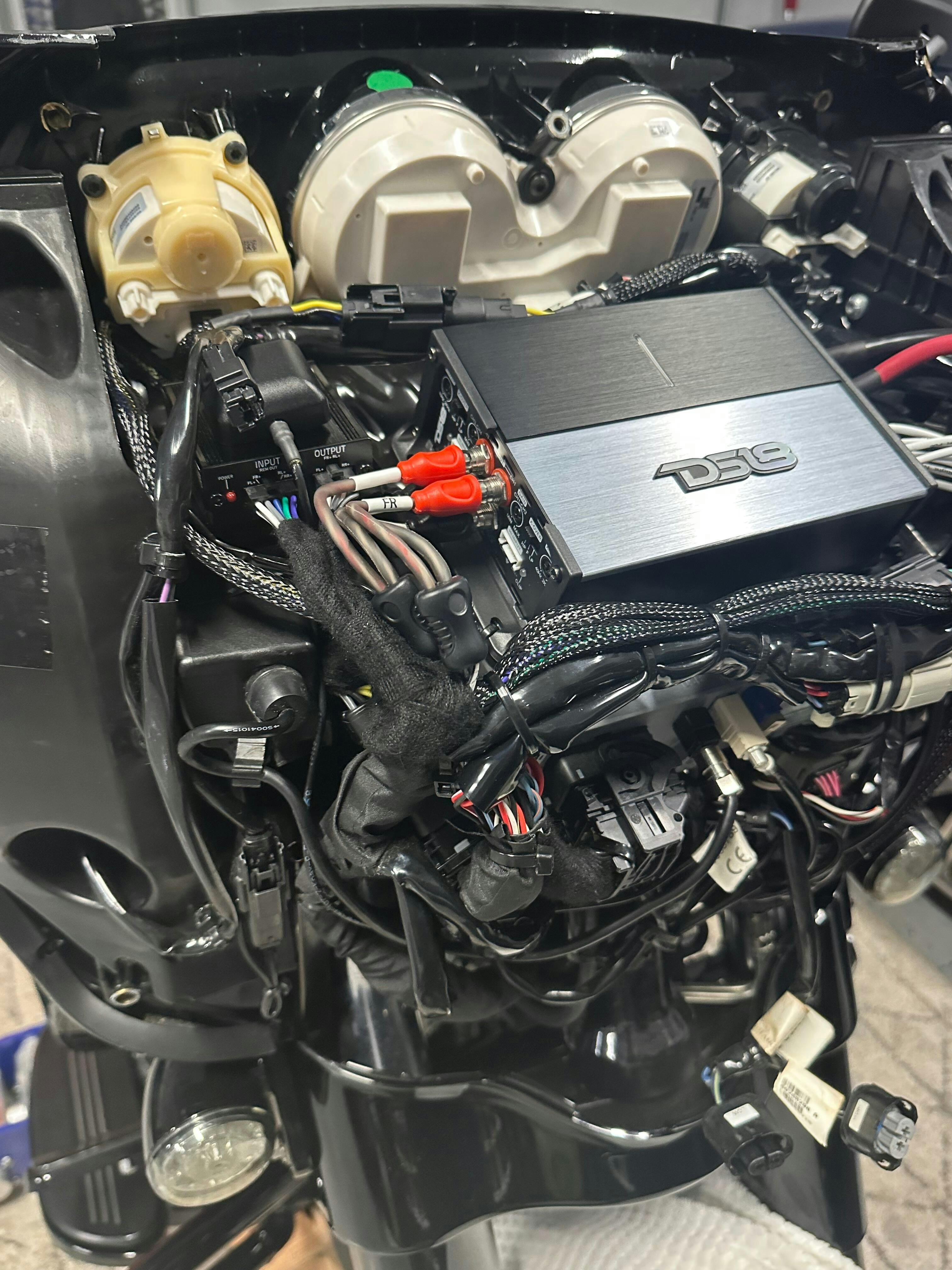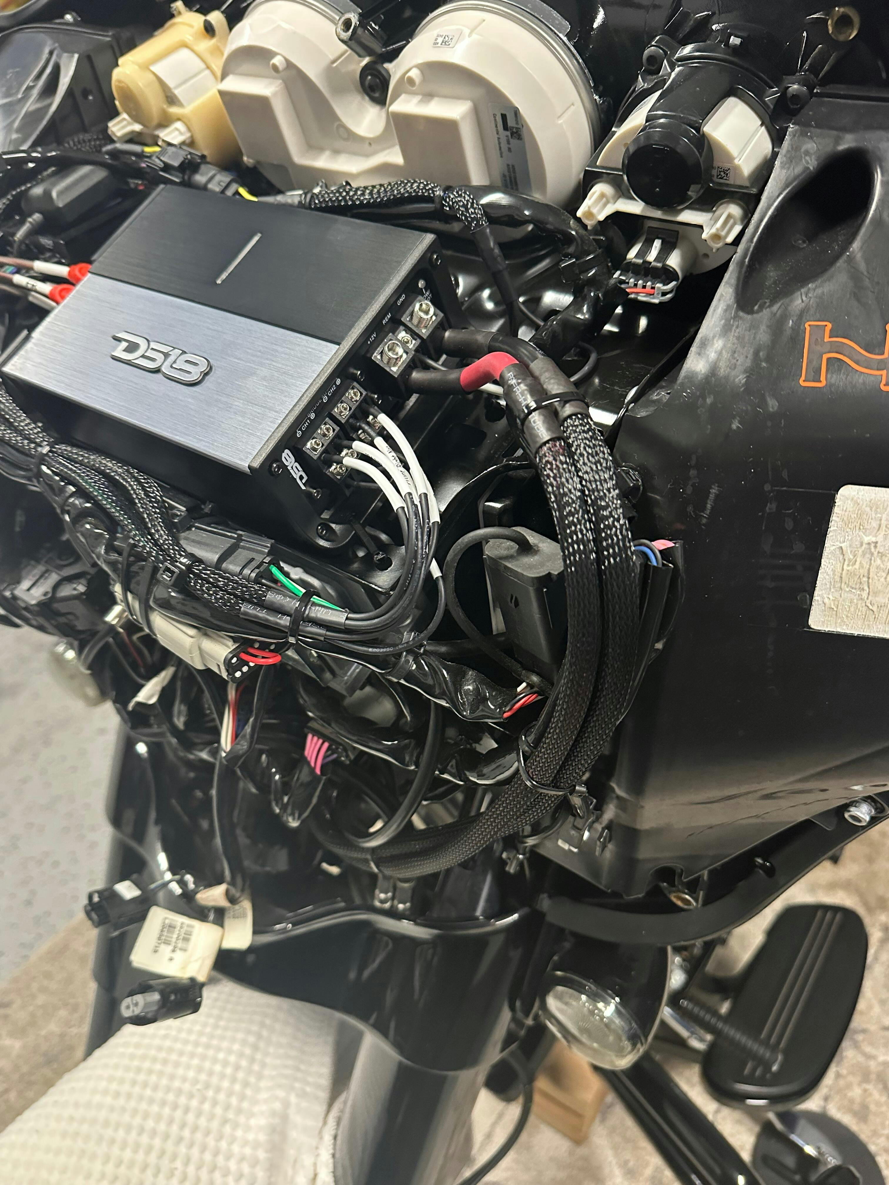 It's compact and fits perfectly packed away in my inner fairing. Packs a nice punch. Running all DS18 speakers, sounds like a live band riding with me on my 2014 Street Glide. Works fine with my stock head unit.